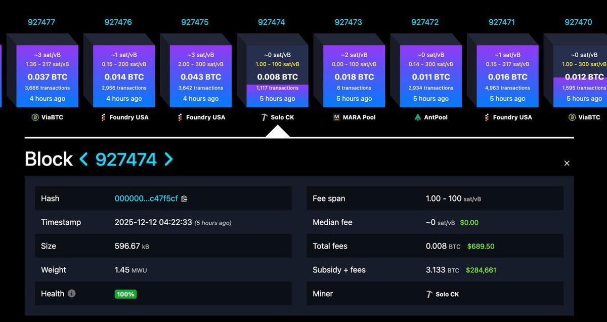 πΈΠ‘ΠΎΠ»ΠΎ-ΠΌΠ°ΠΉΠ½Π΅Ρ ΡΡΠΏΠ΅ΡΠ½ΠΎ Π΄ΠΎΠ±ΡΠ» Π±Π»ΠΎΠΊ 927474 Π² ΡΠ΅ΡΠΈ Π±ΠΈΡΠΊΠΎΠΈΠ½Π°, ΠΏΠΎΠ»ΡΡΠΈΠ² Π²ΠΎΠ·Π½Π°Π³ΡΠ°ΠΆΠ΄Π΅Π½ΠΈΠ΅ Π² ΡΠ°Π·ΠΌΠ΅ΡΠ΅ 3,133 BTC, ΡΡΠΎ ΡΠΊΠ²ΠΈΠ²Π°Π»Π΅Π½ΡΠ½ΠΎ ΠΏΡΠΈΠΌΠ΅ΡΠ½ΠΎ $284 000.
