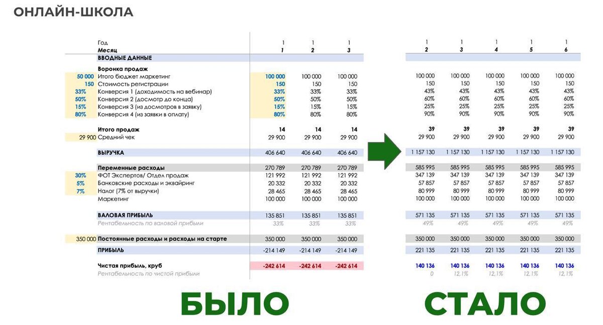 👩🎓👨🎓 Как онлайн-школе сделать х3? #кейс_exchequer Рассказываю подробно, как работать с финансами онлайн-школе на примере нашего реального кейса ✨ ➡️ Что было: Лера, собственница онлайн-школы, чуть ли не плача, приходит на Zoom-созвон. — Ребят, у меня минуса и скоро будут долги, а я не знаю, что с этим делать! Небольшой смол-толк, из которого узнаем, что онлайн-школу запустили с нуля — и вот спустя полгода после запуска пришли к нам с убытками и полным непониманием, что делать дальше. Было потрачено более 770 000 рублей, а результатов не было. И неясно, как выходить в плюс. Второй вопрос: «А какой был план?» — тоже поставил Леру в тупик. Потому что плана: ни финансового, ни по маркетингу — не было. 🤷♂️ Что хуже этого, собственница была заложницей «успешного успеха» на просторах интернета, стартовала на чуйке и свято верила в формат «ща разберемся — все полетит». ➡️ Что сделали: 1️⃣ детально оцифровали все блоки Собрали фактические цифры из всех источников, из каких смо