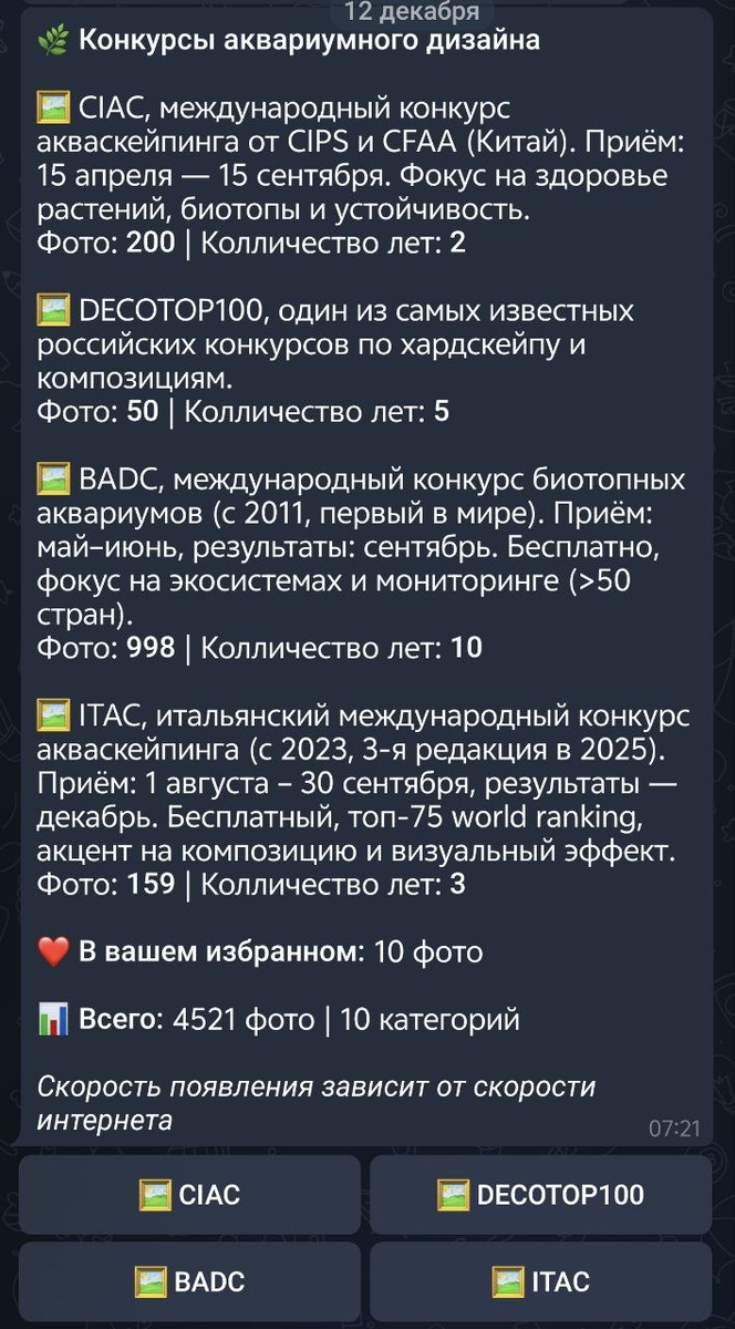 Доброе утро, залил несколько технических обновлений в бота. В том числе пополнилась галерея конкурсов. Появился раздел избранного. Также так как не у всех работ есть информация на фото о параметрах, авторе и тд., добавил поддержку описания в разделе избранного и ссылок на видео, более подробной информации (доп.фото, описания, процесс создания). В дальнейшем буду постепенно вносить информацию и улучшать плавность модуля. Бот: @AquaInspirationBot