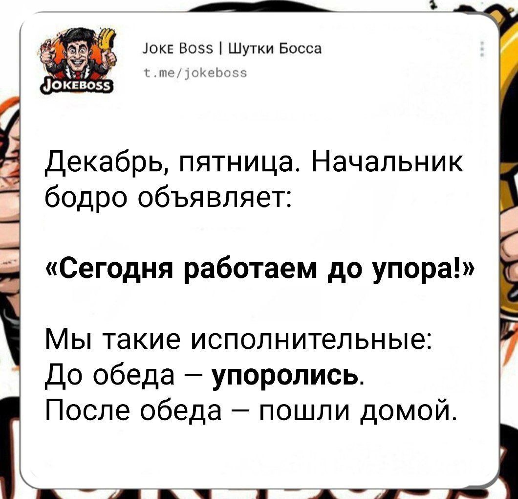 «Работать до упора» — понятие растяжимое. Для начальника это значит «до ночи». Для коллектива — «до момента, когда терпение закончилось, а соцпакет ещё нет». P.S. Если в этот день отдел кадров интересовался, почему вы «упоролись» так рано — всегда можно сослаться на буквальное понимание приказа. Мы же старались! 🏃♂️💨 #РаботаДоУпора #УпоролисьДоДома #НачальникПланируетМыИмпровизируем #ДекабрьскоеИсполнение #пятница #декабрь #новыйгод #юмор #шутки #joke #jokeboss #шуткибосса