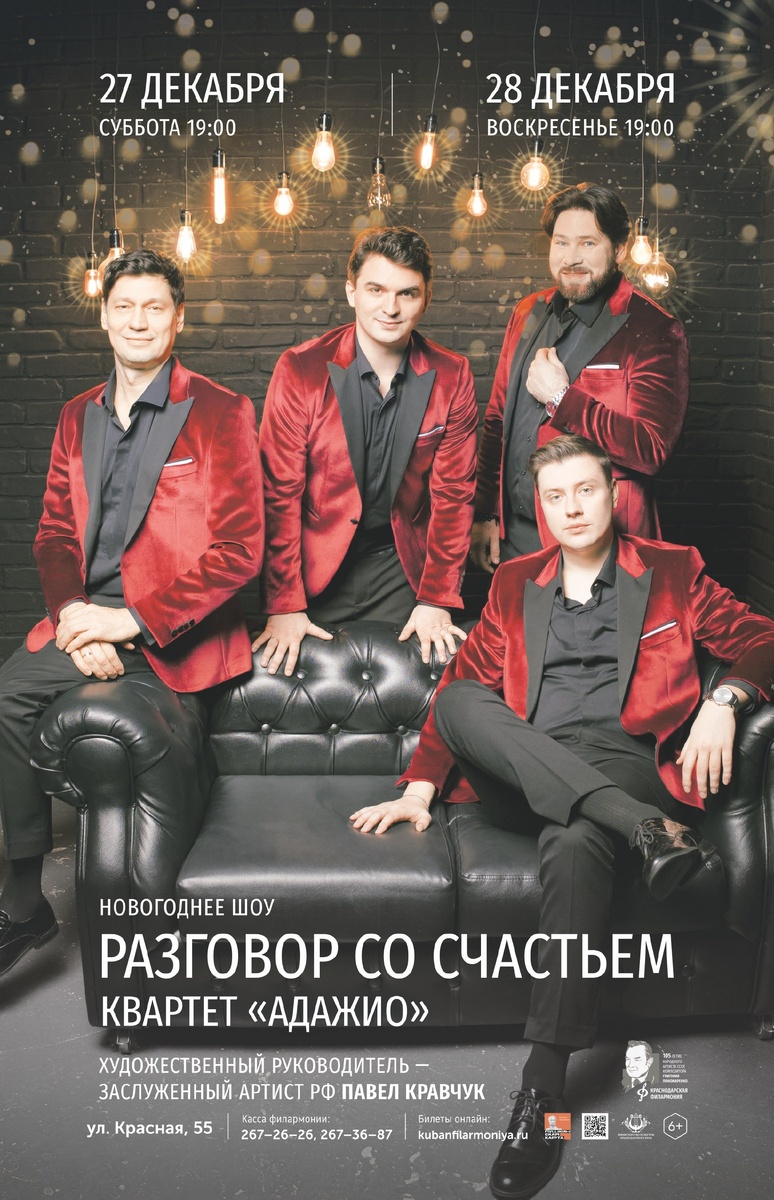 🎤 Концерт «Разговор со счастьем» 27 и 28 декабря в 19:00 ⏰ Приглашаем на яркое новогоднее шоу с квартетом «Адажио» —«Разговор со счастьем»! ✨ В эти волшебные дни квартет «Адажио» подарит зрителям незабываемую праздничную атмосферу, наполненную теплом и радостью зимних песен 🌟 В программе прозвучат любимые композиции, создающие настроение чудес и зимней сказки 🎼 Билеты: https://clck.ru/3QnxFy Касса: 267-26-26 📞