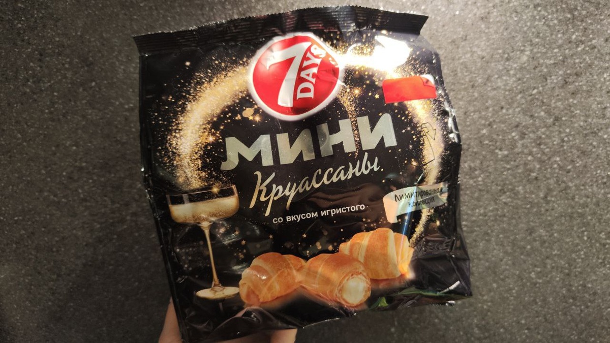😘😘😁😘😁😘😁😘 для новогоднего настроения 😀😄 Ох уж этот вкус игристого добрался и до круассан😁 Игристое в аромате не читается, пахнет просто вкусными круассанчиками. Сами рогалики мягкие, воздушные, но нужно помнить - засыхают быстро. Крем как будто сливочный с привкусом сгущенки. На послевкусие есть кислинка, видимо имитирующая игристое. Как раз послевкусие мне и не понравилось (я просто не люблю алкоголь, чем передана эта кислинка - не знаю, в составе есть спирт этиловый, но его часто используют для придания нужной консистенции и текстуры). Это первая вкусняшка, где вроде как на послевкусии есть нотки игристого, в отличии от шоколадки и чипсиков. Я же остаюсь фанатом обычных 7day's со сливочным кремом🥰 #НГсладость #десерт #обзореды #вкусняшка #сладкоежка #фудблог #фудобзор #россия