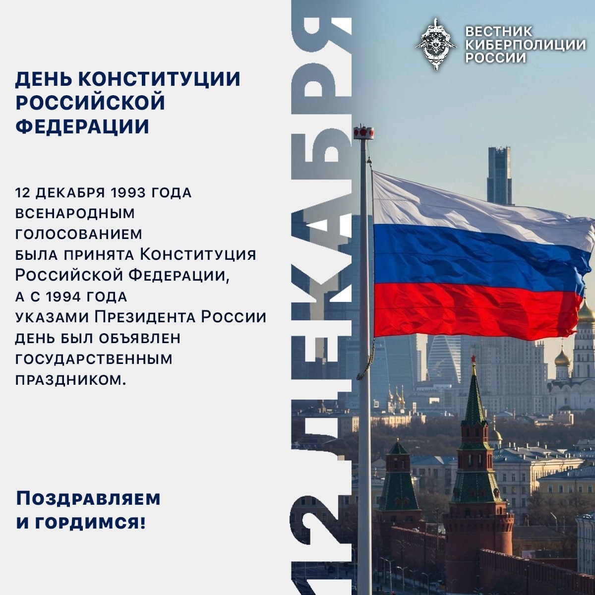 12 декабря 1993 года в ходе всенародного голосования граждане Российской Федерации приняли Конституцию Российской Федерации. 🇷🇺В референдуме приняли участие свыше 58 миллионов человек, выразив тем самым свою волю на построение правового, демократического государства. 25 декабря 1993 года Конституция вступила в силу, став правовой основой современной России. С этого момента страна утвердилась как федеративное государство с республиканской формой правления, в котором реализуется принцип разделения властей на законодательную, исполнительную и судебную. 🇷🇺 Указом Президента Российской Федерации от 19 сентября 1994 года 12 декабря объявлено Днём Конституции Российской Федерации, а 21 июля того же года праздник включён в перечень памятных дат России. 🫡Подписаться на Киберполицию России 📲 Max I 📱 ВK I 📱 ОK 🇷🇺 Чат-бот Киберполиции России 🫡 Поддержать канал