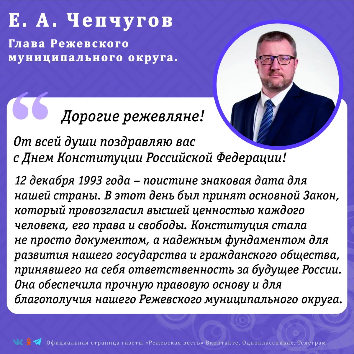 Режевляне всегда славились своим трудолюбием, целеустремленностью и готовностью воплощать в жизнь любые начинания. Убежден, что наша совместная и ответственная работа позволит нам в полной мере реализовать все провозглашенные Конституцией права и свободы каждого жителя! Желаю вам здоровья, мира и благополучия!