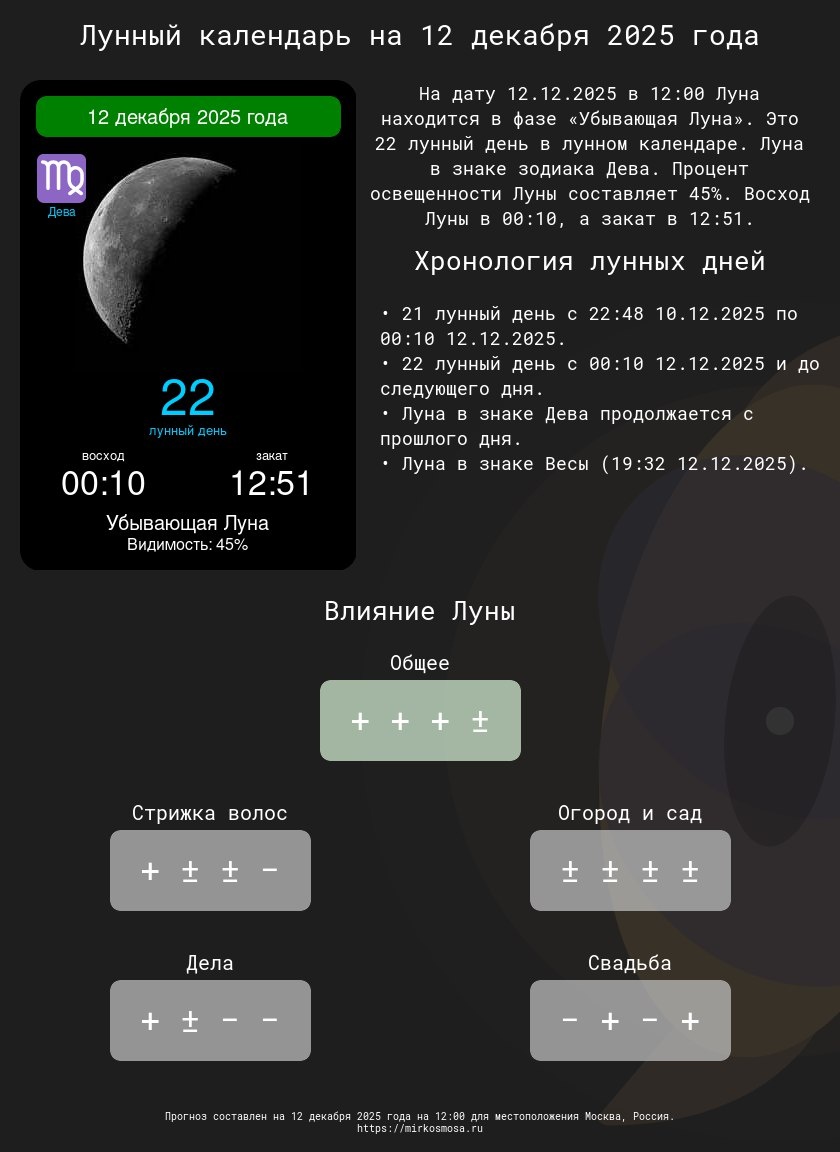 Лунные календари на 12 декабря 2025 года: Подготовьтесь к этому дню с учетом влияния Луны! 🔹🌗 Лунный календарь на 12 декабря 2025 года — Что приготовила Луна? Подробнее 🔹✂️ Лунный календарь стрижек на 12 декабря 2025 года — Подходящий ли день для обновления прически? Подробнее 🔹🌱 Лунный календарь огородника и садовода на 12 декабря 2025 года — Лучшее время для ухода за растениями. Подробнее 🔹📅 Лунный календарь дел на 12 декабря 2025 года — Удачные моменты для важных задач. Подробнее 🔹💍 Лунный календарь свадеб на 12 декабря 2025 года — Подходит ли этот день для вашего торжества? Подробнее