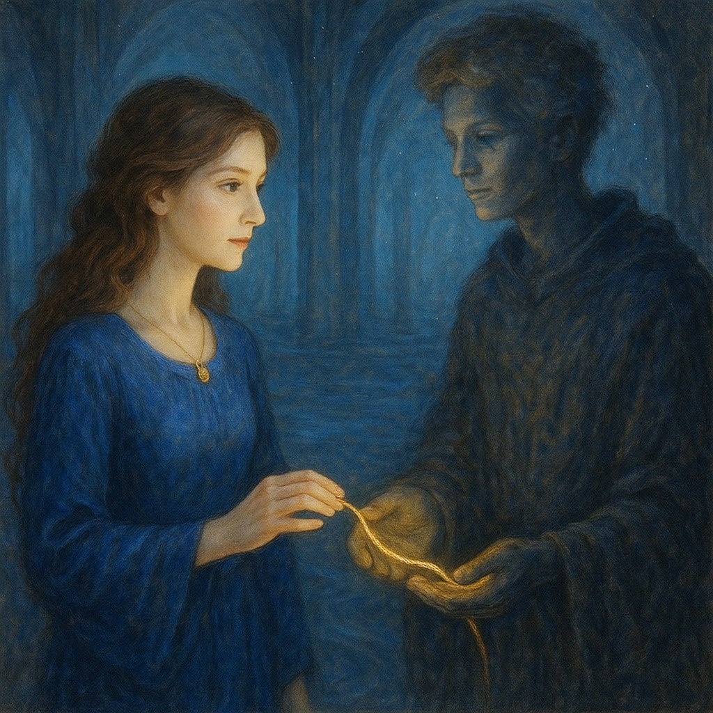 ✨ Сказка о Волшебнице Элине и Стражe Судеб После встречи с Лесным Духом — хранителем родовых связей, Элина стала замечать, что мир вокруг словно разговаривает с ней. Не словами — знаками. Не просьбами — напоминаниями. То незнакомый человек случайно произносил фразу, которая становилась началом новой сказки. То вдруг на её пути появлялись птицы, которые, как казалось Элине, приносили послания в своих крыльях. Но однажды произошло странное — даже для неё. 🌌 Ночью Элина проснулась — её разбудил лёгкий серебристый свет, который струился прямо по полу, как будто комната стала долиной, а по ней текла лунная река. Элина встала и пошла по свету — так, как когда-то пошла по зову Леса. Свет вывел её к двери, которой раньше не было. На двери был знак — переплетение трёх линий, похожих на спираль. Элина прикоснулась к двери — и оказалась в другом пространстве. Это был огромный зал. Не темнота — но и не свет. Что-то между. Будто место между вдохом и выдохом мира. Посреди зала стоял Страж. Е