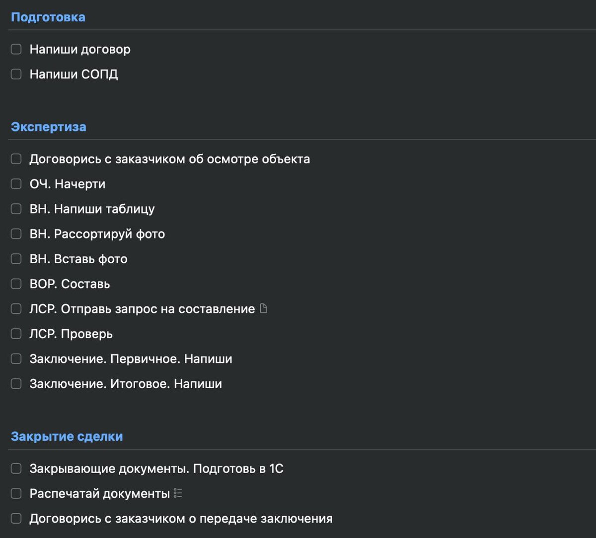 Как спланировать жизнь на 80% Знаете как сэкономить своё время и силы заполнив список задач на 80% на год вперед? А может даже больше года. Причем важными задачами, которые рано или поздно нужно будет сделать. Запишите все повторяющиеся задачи и поставьте им в задачнике повторение. Готово. Вы заполнили 80% всех своих задач) Серьезно, бОльшая часть всех задач повторяются каждый день/неделю/месяц/год. Даже различные проекты от разных заказчиков состоят из одних и тех же задач. Там не поставить повторение, но список составить точно можно. Ниже прикрепил скриншот моего шаблона задач для строительной экспертизы. Вообще шаблоны чего бы то ни было, это золото тайм-менеджмента. Например, мой чек-лист приемки черновой квартиры состоит из 213 пунктов с нормативами. Представляете сколько бы времени я тратил каждую приемку на их написание вручную?) И это относится не только к работе. Оплата коммуналки, кредитов, заказ продуктов и прочих бытовых вещей и планирование дня/недели/месяца. Всё это