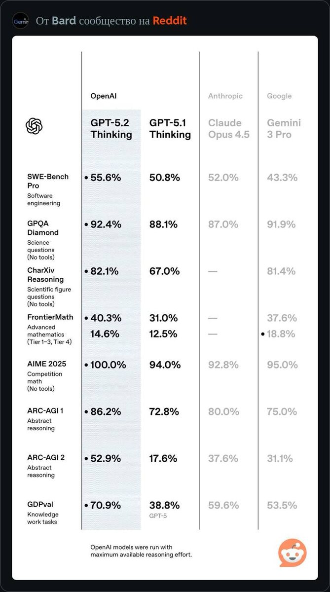 GPT 5.2 вышел и вот сравнение с Gemini 3.0 pro. Только вчера мучал Gemini дабы отбрехаться от некорректно начисленного налога как физику :) … загрузил в него массу сверок из ФНС и попросил найти ошибки. Справился. А GPT 5.2 еще лучше. Хотя казалось бы, куда уж более то. Русский ИТ бизнес