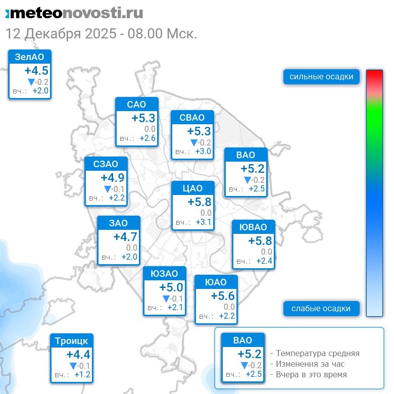 В 8:00 в Москве было от +3.8°C до +6.4°C, средняя температура +5.2°C #погода #Москва #зима #температура #12декабря #пятница