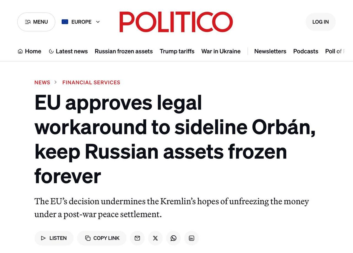 ⚡️ЕС одобрил механизм, позволяющий сохранить российские активы замороженными до выплаты репараций, - Politico