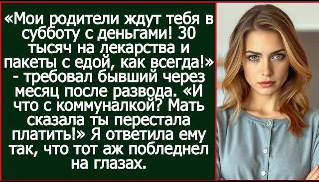 — Сергей, помнишь прошлый месяц перед нашим разводом? Я дала тридцать тысяч. Ты сказал — отцу на срочное обследование и лекарства. Я отдала последние, отложенные на отпуск. А через неделю я зашла в соцсети и увидела фото твоих родителей. Ресторан «Панорама», устрицы, дорогое вино. И подпись: «Отмечаем годовщину свадьбы, спасибо детям за помощь». Счет на столе лежал так, чтобы сумму было видно — двадцать восемь тысяч. Они проели мои деньги за один вечер, пока я сидела на гречке.