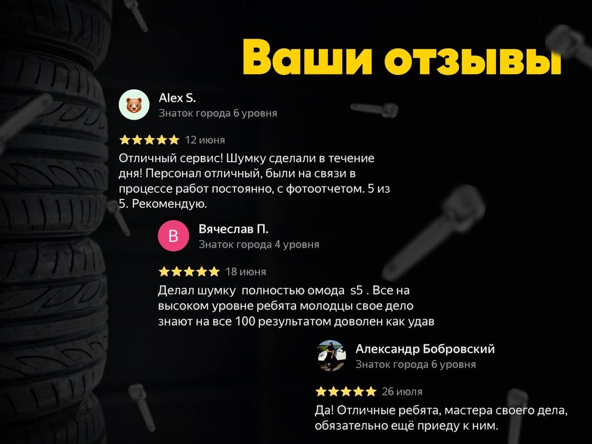 🎵 «Штатная акустика зазвучала на шаг лучше» С такими отзывами скоро распустим рекламщиков за ненадобностью 🤗 Всем, кто не забыл поделиться мнением про наш сервис – огромная благодарка . Отдельный привет Кириллу за максимально развернутый и подробный отзыв 🤝