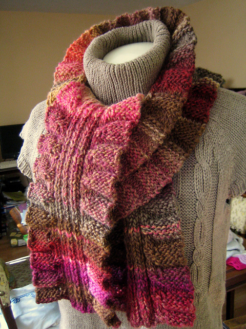 Повторение: Повторяйте эти 4 ряда до достижения длины шарфа в 180 см (или желаемой длины). Примечание С помощью такой каймы можно связать бактус, выполняя прибавки и убавки для формирования треугольной формы. Такая кайма вяжется поворотными рядами, но с одного края полотна, и с этого же края выполняются прибавки и убавк