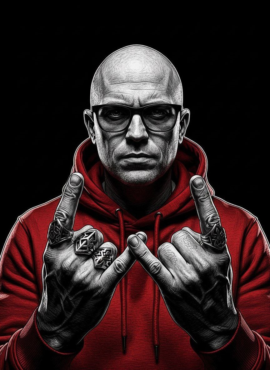 I took this photo without altering the face in the slightest.A close-up portrait shot, approximately 40-60 cm from the face, with a slightly low angle, so that the hands and the "rock sign" hand gesture are dominant in the foreground.The subject is a man with a typical street-style style, wearing thin-rimmed glasses and a thick, textured red hoodie.The hands are very close to the camera, taking up most of the frame, and large, intricately carved metal rings are on several fingers.The hand pose forms a rock/metal gesture.The face looks firm and calm, with dramatic, high-contrast rim-light lighting.The background is completely pitch black, creating complete focus on the subject.The rendering style is highly detailed, resembling an engraved illustration or metal engraving. The overall tone is harsh, bold, and intense, highlighting a strong and charismatic persona.The dominant colors are black, white, and bright red.The lighting is dramatic, the mood edgy, and the high-definition, hyper-re