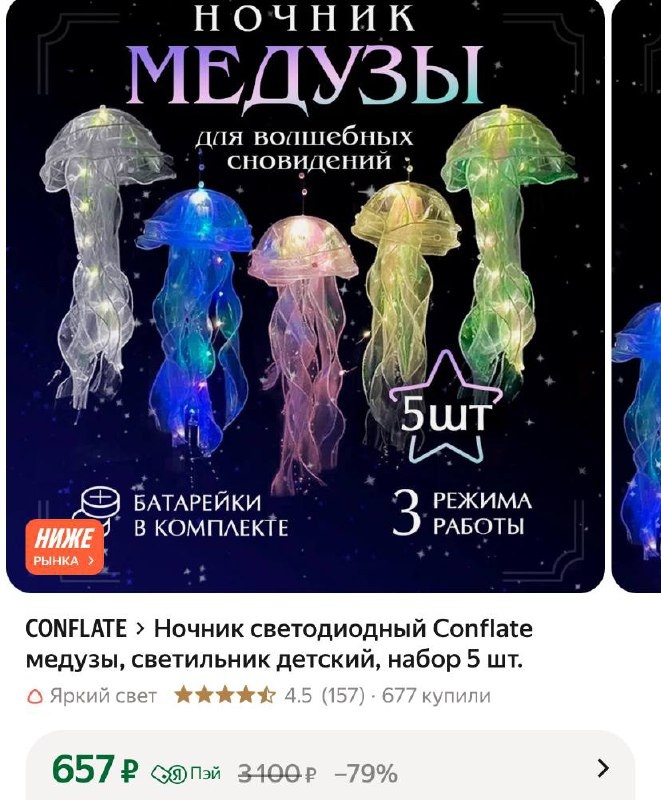 Ночник светодиодный Conflate медузы, светильник детский, набор 5 шт. https://market.yandex.ru/cc/8ECKEY ⭐️ PFRLT-27-AF — скидка 1 000 ₽ на первый заказ от 4 000 ₽* ⭐️DEC122-AF - Скидка 100 ₽ на один любой заказ при покупке от 5000 ₽ на все товары, кроме категорий исключений ✅ Канал по скидкам 🔣 Бот с промокодами