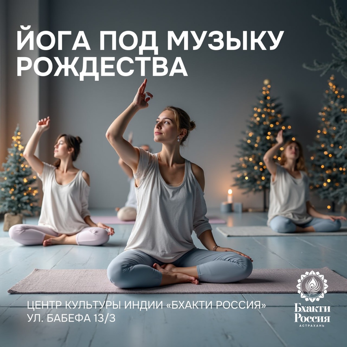 ЙОГА ПОД МУЗЫКУ РОЖДЕСТВА • 21 декабря | 14:00 • Центр культуры Индии «Бхакти Россия», ул. Бабефа, 13/3 Подарите себе атмосферу праздника и внутреннего тепла на уникальной практике Хатха-йоги под новогодние и рождественские мелодии. 🎻 Классическая музыка, уютные мелодии из советских фильмов, новогодние ретро-напевы и рождественские хоралы создают особое ощущение чуда. 🍊 Практика помогает расслабиться, восстановить гармонию тела и души и немного вернуться в детство. ✔Преподаватель: Тимофеева Наталия – сертифицированный инструктор по Хатха-йоге с многолетним опытом работы. ✔ Регистрация и вопросы: +7 961 815-74-76 Наталья