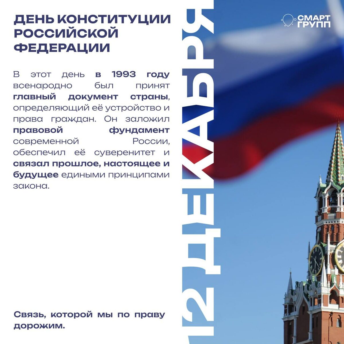 🇷🇺Поздравляем с Днём Конституции РФ! 📃Сегодня мы отмечаем важный праздник, который напоминает о фундаментальных ценностях, объединяющих нашу страну и определяющих её движение вперёд. ⚡️Компания Смарт Групп желает профессионального и личного роста, смелых идей, надёжных партнёров и уверенности в завтрашнем дне. ❤️Пусть в вашей жизни всегда царят порядок, справедливость и гармония — ведь именно эти принципы лежат в основе устойчивого развития и благополучия. Telegram▫️VK▫️RuTube▫️Дзен▫️vc.ru #Смарт_групп_поздравляет