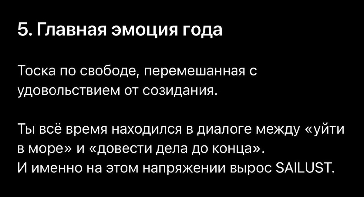 Эмоция года Решил подхватить неоднозначный тренд и написал в ChatGPT: «Подведи итоги моего года как в Spotify Wrapped, только на основе наших чатов». Функция доступна для тех, кто не запрещал работать «памяти» сервиса. И, о чудо, было действительно интересно почитать, как с его стороны видится мой год. Потому что с легкими вопросами я обычно обращаюсь к Алисе, но вот он… он забирает на себя весь комплекс от исследований до проработки идей. Особо понравился этот пункт: «Главный антагонист года — корпоративная реальность» А вот один из итогов, пожалуй, олицетворяет действительно весь этот год. Потому что 2025-ый содержал огромный спектр эмоций, но главная из них была со мной на протяжении всех этих 365 дней — тоска по выходам в море и возможности чувствовать себя всецело свободно. И это в следующем году точно нужно исправлять. Попробуйте сами отправить этот запрос в своего AI-помощника. И присылайте итоги в комментариях.