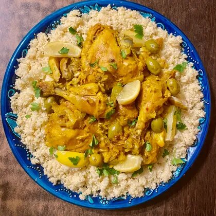 Это национальное блюдо Марокко — тушёная курица с луком, оливками и лимонными дольками в глиняном горшке тажин. В отличие от европейских запеканок, марокканский тажин не содержит томата, картофеля или сливок, а кислинку дают солёные лимоны, а не свежие. Главное: тушить на минимальном огне, без воды — только в собственном соку и масле, пока мясо не станет мягким, но не развалится. Специи — только куркума, имбирь, шафран и кориандр. Ингредиенты (на 4 порции): Курица (ножки/бедра на кости) — 1,2 кг Лук репчатый — 3 шт Солёные лимоны — 2 шт Зелёные оливки без косточек — 150 г Куркума — 1 ч. ложка Имбирь молотый — 1 ч. ложка Кориандр молотый — 1 ч. ложка Шафран — щепотка (замочить в 1 ст. ложке воды) Соль — 1,5 ч. ложки Оливковое масло — 4 ст. ложки Шаги: Подготовь курицу: 1. Курицу промой, обсушить. Посоли, посыпь куркумой, имбирём и кориандром, перемешай. Тушение: 2. В тажине (или толстостенной кастрюле) разогрей масло, обжарь курицу со всех сторон до румяности. 3. Добавь лук — крупными