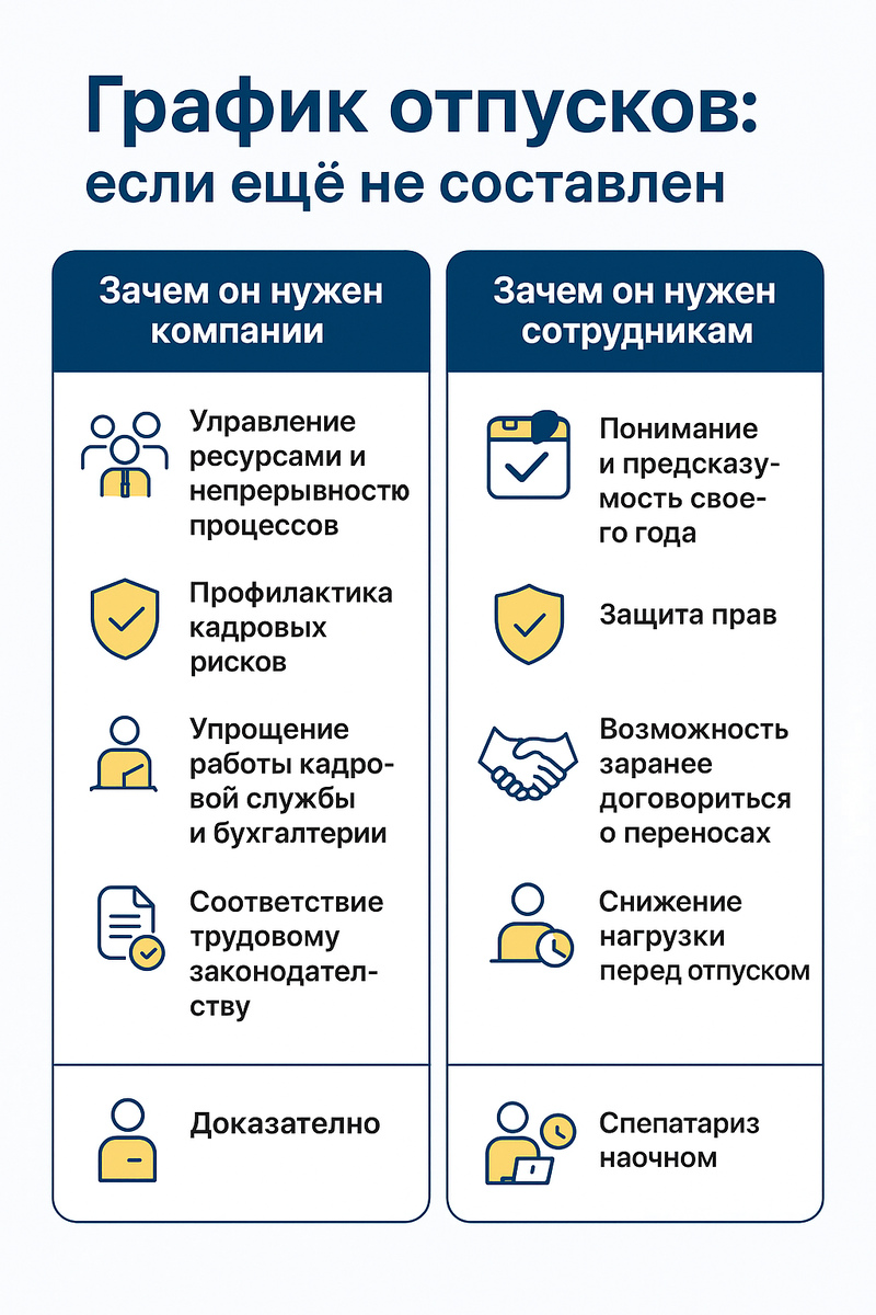 График отпусков — один из тех документов, о важности которых вспоминают в последний момент. Часто компании откладывают его оформление до января, а иногда и вовсе формируют формально, не задумываясь, какую пользу он может принести. Однако правильно подготовленный график — это инструмент, который помогает и работодателю, и сотрудникам эффективно планировать год, избегать конфликтов и правильно распределять ресурсы. Разберём, зачем он нужен, что даёт в ежедневной работе и почему его важно составлять вовремя. Почему график отпусков обязателен График отпусков — это не просто рекомендация или удобный инструмент планирования. Для всех работодателей, включая малый бизнес, он является обязательным документом, предусмотренным Трудовым кодексом РФ. Он должен быть сформирован не позднее чем за две недели до начала календарного года. А значит, если его ещё нет — лучше заняться этим как можно скорее. Зачем график отпусков компании 1. Управление ресурсами и непрерывностью процессов Когда сотрудники