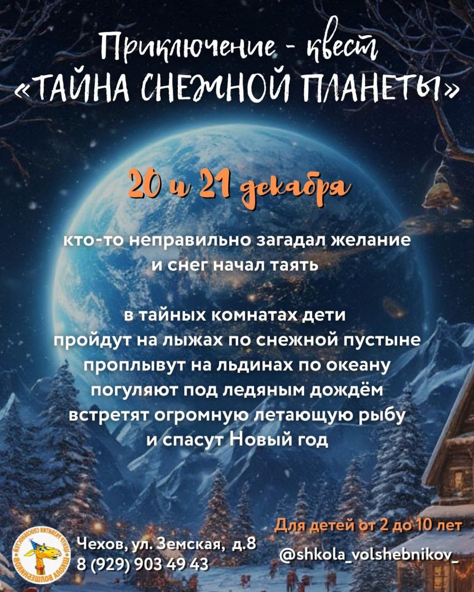 ✨🎄ПРИКЛЮЧЕНИЕ - КВЕСТ🎄 «ТАЙНА СНЕЖНОЙ ПЛАНЕТЫ» для детей от 2 до 10 лет 🗓️20 и 21 декабря 👍группы 8 - 12 человек (по возрастам) ❤ уникальный сценарий с учетом психологии ⚡️кто-то неправильно загадал желание и снег начал таять 🚪в тайных комнатах дети ⛷ пройдут на лыжах по снежной пустыне 🏊♂️проплывут на льдинах по океану ☔️погуляют под ледяным дождём 🐠встретят огромную летающую рыбу ❄ спасут Новый год! А что ещё? 📷новогодняя фотозона 🎅🏼волшебные фокусы от Деда Мороза 🎊дискотека с летающим снегом 🎁несладкий подарок 💸ЦЕНА (ребенок + родитель) : 2200 р - при оплате до 08.12.24 2500 р - при оплате до 13.12.24 2700 р - при оплате до 18.12.24 2900 р- при оплате в день квеста Скорее записывайтесь, свободных мест мало‼️ 📞https://wa.me/+79299034943 💻https://vk.com/volshebnikiclub 🏢 Центр Развития "ШКОЛА ВОЛШЕБНИКОВ" 📍 г.Чехов, микрорайон Губернский, ул.Земская, д.8 #нгчехов #интересноЧехов ✅ Мероприятия Чехов https://dzen.ru/id/66cc4b48e9ef144699238a51 http://vk.com/c
