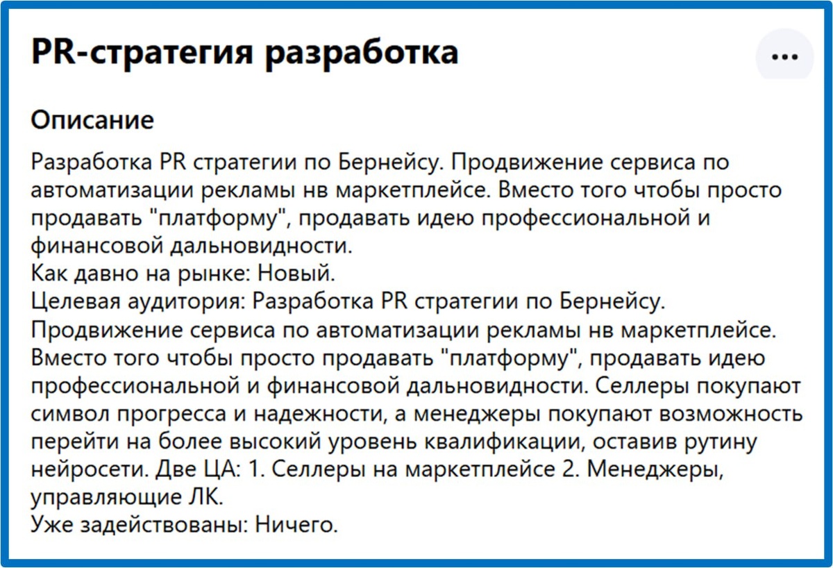 Очень интересно. Давайте проанализируем вот этот запрос ☝️. Компания выводит на рынок сервис для автоматизации работы на маркетплейсах. Кто-то в команде решил, что надо действовать креативно и не просто продавать платформу в лоб, а воспользоваться лучшими мировыми практиками. Из этих лучших мировых практик они выбрали подход Эдвард Бернейса, которого называли “гением пиара”. Считается, что он приучил женщин Америки курить и всех есть на завтрак жареный бекон. И вот они ищут подрядчика на “Разработку PR-стратегии по Бернейсу”. Вроде бы все классно. Хороший подход? А вот нет. Абсолютно провальная идея. Если они пойдут этим путем, то потеряют время и деньги. Перечислю причины. 1. Изначально неправильно выбрана специализация специалистов. PR - это работа со средствами массовой информации. То есть взаимодействие с журналистами газет, журналов и т.д. Что было действительно очень актуально во времена Бернейса. Но выход на аудиторию селлеров маркетплейсов через СМИ - так себе идея. Есть