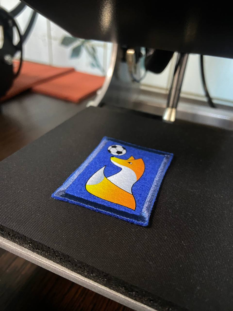 Мы долго размышляли, как ускорить процесс и при этом сохранить ту самую глубину цвета, которую просят клиенты Помню, когда впервые соединили вышивку с DTF-принтом на одном шевроне, как-то даже удивительно было, вроде простое решение, а шли к нему так долго И вот уже вошло в стандартное решение по шевронам. Одно из последних это небольшие шевроны с лисицой. Помню как разложили готовую работу на столе: синий контур шеврона, вышитый плотными стежками, держал форму. А поверх него - яркий лисенок с футбольным мячом, напечатанный DTF-методом. Плавные переходы от оранжевого к жёлтому на мордочке, которые вышивкой пришлось бы выкладывать долго-долго, легли за минуты Когда провели рукой по поверхности, ощущения оказались весьма приятные. объёмный рельеф вышитой рамки приятно цеплялся за пальцы, а принт внутри, гладкий и мягкий, будто всегда был частью ткани Когда шеврон сам задаёт структуру вышивкой, а детали внутри оживают через DTF-градиенты, рождается что-то большее, чем просто нашивка