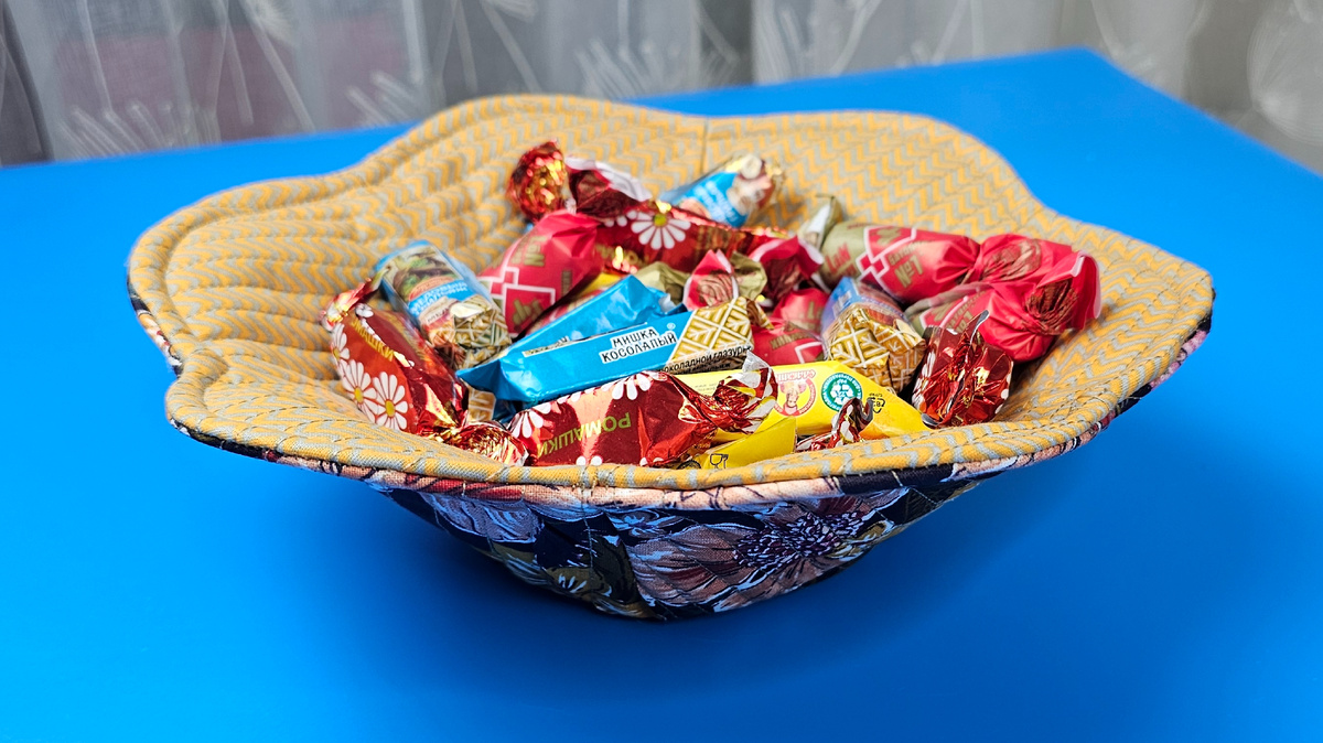 Всем привет! Сегодня я раскажу, как очень просто сшить милые и практичные корзинки из ткани. Они отлично подходят для конфет, фруктов, декоративных мелочей и станут чудесным подарком на любой праздник! Шьются быстро и легко, а выглядят стильно и уютно. Для начала берем любой лист или кальку Вырезаем вот такой милый цветочек Далее нам нужны два отреза симпатичной ткани И такие же два отреза синтепона. Сверху мы кладем ситец и стегаем спямой строчкой на рассоянии 1 см. Далее на полученные квадраты накладываем наш шаблон и вырезаем без припусков на шов У полученных цветочков сшиваем вытачки Получились такие вазочки Складываем их вместе, личевыми сторонами друг к другу и сшиваем по краю, оставляя небольшое отверстие, чтобы потом вывернуть на лицевую сторону выворачиваем И посмотрите какая милая вазочка под конфеты или другие мелочи у нас получилась! Создавайте полезные и красивые вещи своими руками! ✨🎁