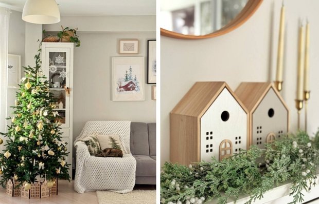 Особый акцент был сделан на домик-раскладушку под елкой, который окутывает основание ели, добавляя тепла и заботы к общему настроению. Простота и натуральные материалы домиков прекрасно соответствуют минималистичному тренду, актуальному в этом сезоне. Роспись на них Лиля делала сама обычным белым контуром для росписи.