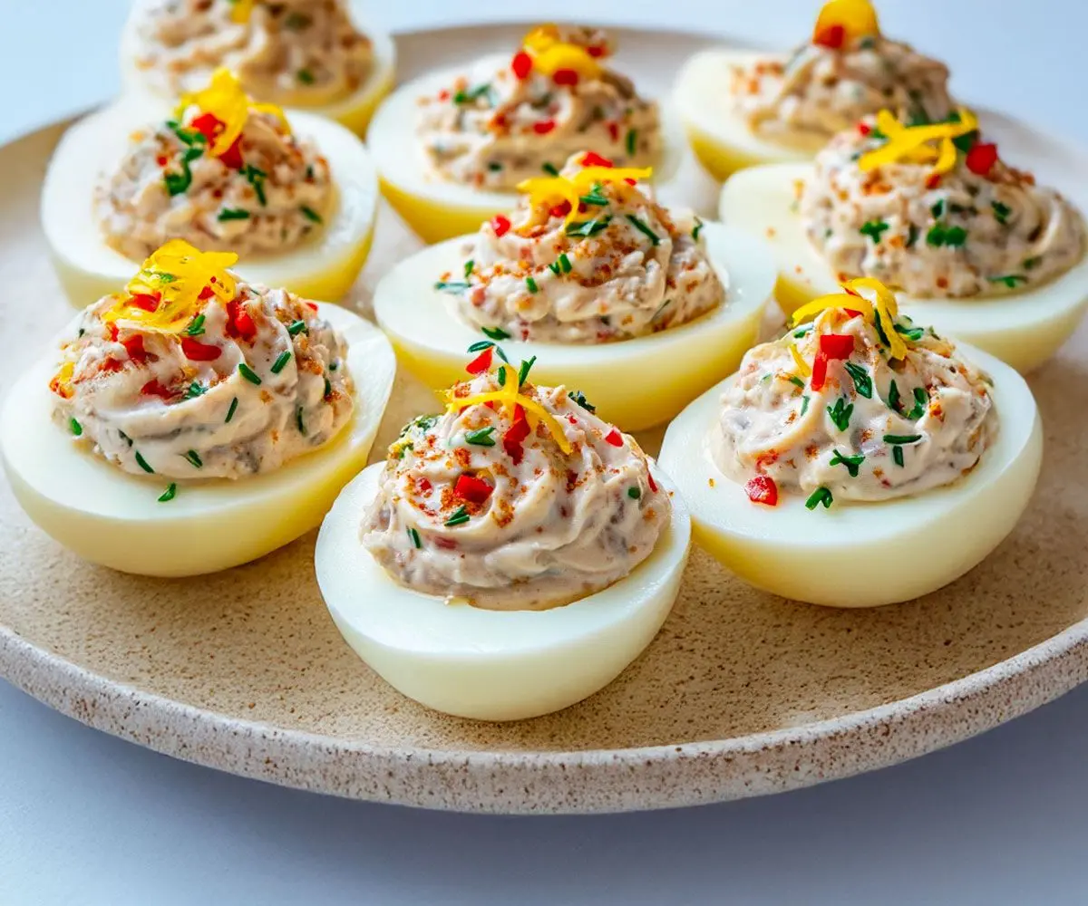 Разрежьте их вдоль пополам и аккуратно выньте желтки . Начинка: В миске разомните яичные желтки с отцеженным тунцом , майонезом , сливочным сыром и горчицей . Смешивайте до получения однородной гладкой текстуры. Приправа: Добавьте лимонную цедру, соль, перец и нарезанный зеленый лук . Попробуйте и отрегулируйте вкус по своему ус