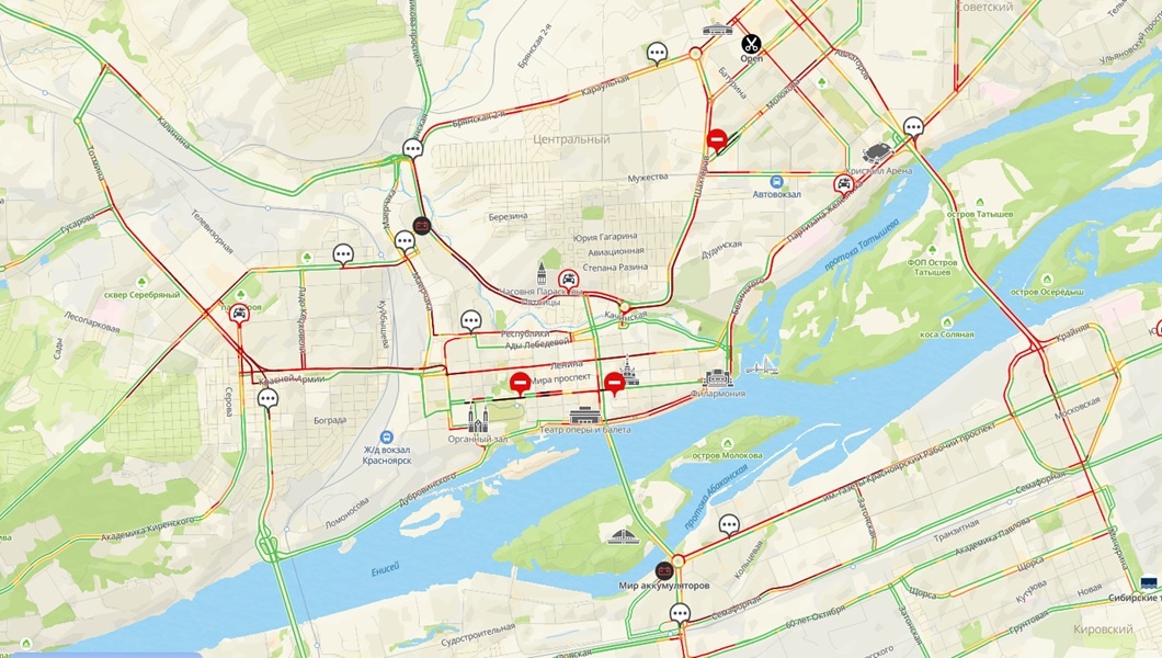 Красноярск вечером в пятницу встал в 9-балльные пробки. Горожане с трудом пытаются добраться до дома. Судя по картам 2ГИС, стоит весь город. Однако хуже всего ситуация на улицах Ленина, Республики, Брянская, Копылова, Красной Армии, Дубровинского, Шахтёров, Партизана Железняка, Северное шоссе, проспекте имени газеты «Красноярский рабочий» и на Октябрьском мосту. Также на некоторых улицах движение затруднено из-за ДТП: на Ленина, Брянской и Партизана Железняка. В Госавтоинспекции водителей настоятельно просят быть предельно внимательными за рулём, выбрать безопасную скорость и соблюдать дистанцию. фото: 2ГИС.