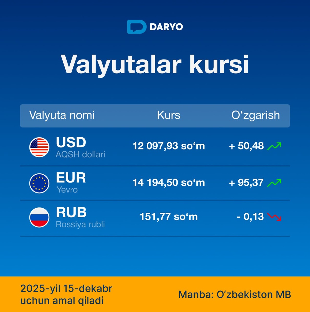 O‘zbekistonda dollar kursi yana ko‘tarildi 🇺🇸 dollar 12 097,93 soʻm (+50,48) 🇪🇺 yevro 14 194,50 soʻm (+95,37) 🇷🇺 rubl 151,77 soʻm (-0,13) Dollar rasmiy kursi 4-dekabrdan buyon tushmadi. @daryolive