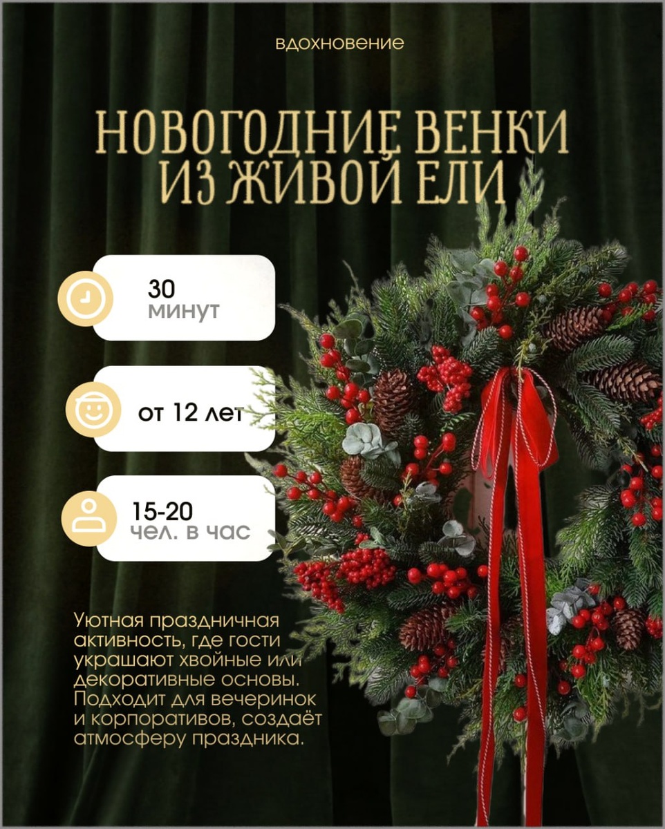 Новые идеи для уютной и праздничной подготовки к Новому году уже здесь! В прошлом году самым популярным мастер-классом в декабре стали венки из натуральной ели 🎄 Что создаём: 🌟Новогодние и рождественские венки в классическом и авторском стилях 🌟Декорируем шишками, ягодами, лентами, сушёными апельсинами, колокольчиками и мини-шариками Каждый участник уносит домой красивый венок, который сразу можно повесить на дверь или подарить близким. Наш выездной МК — это: 🌟Все материалы включены: хвоя, шишки, сухоцветы, ленты, декоративные элементы 🌟Нет необходимости иметь мастерскую: мы привозим всё и организуем рабочее пространство прямо на вашем столе 🌟Подходит для любых локаций: квартиры, офисы, коворкинги, кафе, арт-пространства 🌟Подходит для любой аудитории: дети от 12 лет, подростки, взрослые — мастер-класс адаптируется под уровень участников Давайте творить вместе: @masterpodelkin 🌟