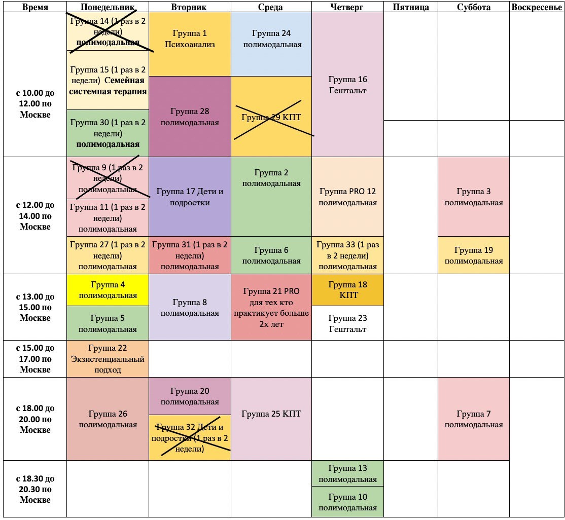 1.Когда в следующий раз запись откроется? - Через 4/5 месяцев 2. Есть возможность начать через неделю или просто пропустить ближайшую встречу после записи? - Да, такая возможность есть, предупредите модератора и начните позже, можно даже в январе 3. Хочу в группу, но придется заканчивать на 10-15 минут раньше или с выключенной камерой, насколько это безопасно для группы? -Такое возможно, если предупредить об этом модератора 4. Как работают группы в праздничные дни? - В праздники мы не работаем до 12го января 5. Если недавно начала обучение, мне пока рано на интервизию? Или уже можно? - Если вы готовы предоставлять гипотезы по кейсам и готовы в перспективе 6 месяцев взять клиента в работу, то тогда подходит, если нет, то я бы записалась позже 6. Как выбрать группу если еще нет подхода? - Пойти в полимодальную, там сможете посмотреть как работают коллеги и определиться 7.Подскажите, если сейчас запишусь в группу с подходом, будет возможность попозже в полимодальную ещё за