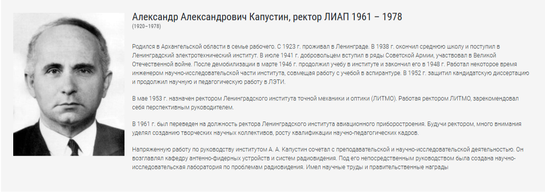 В этот момент в ЛИАП происходит смена руководства. Ректором института летом 1961 года был назначен молодой, энергичный кандидат технических наук, доцент Александр Александрович Капустин, который до этого несколько лет возглавлял Ленинградский институт точной механики и оптики (ЛИТМО).