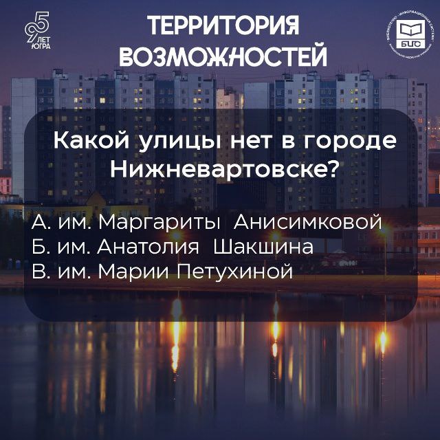 💝 Югра отпраздновала свой юбилей, но мы продолжаем узнавать всё больше и больше о нашем крае и людях, которые здесь живут. 📝 Предлагаем пройти небольшую викторину и проверить себя. Внимание, вопрос: ❓ Какой улицы нет в городе Нижневартовске? А. Улица имени Маргариты Анисимковой Б. Улица имени Анатолия Шакшина В. Улица имени Марии Петухиной Свои ответы пишите в комментариях👇 #mubisnv #mubisnv_территориявозможностей #библиотекинижневартовска #югре95 #викторина