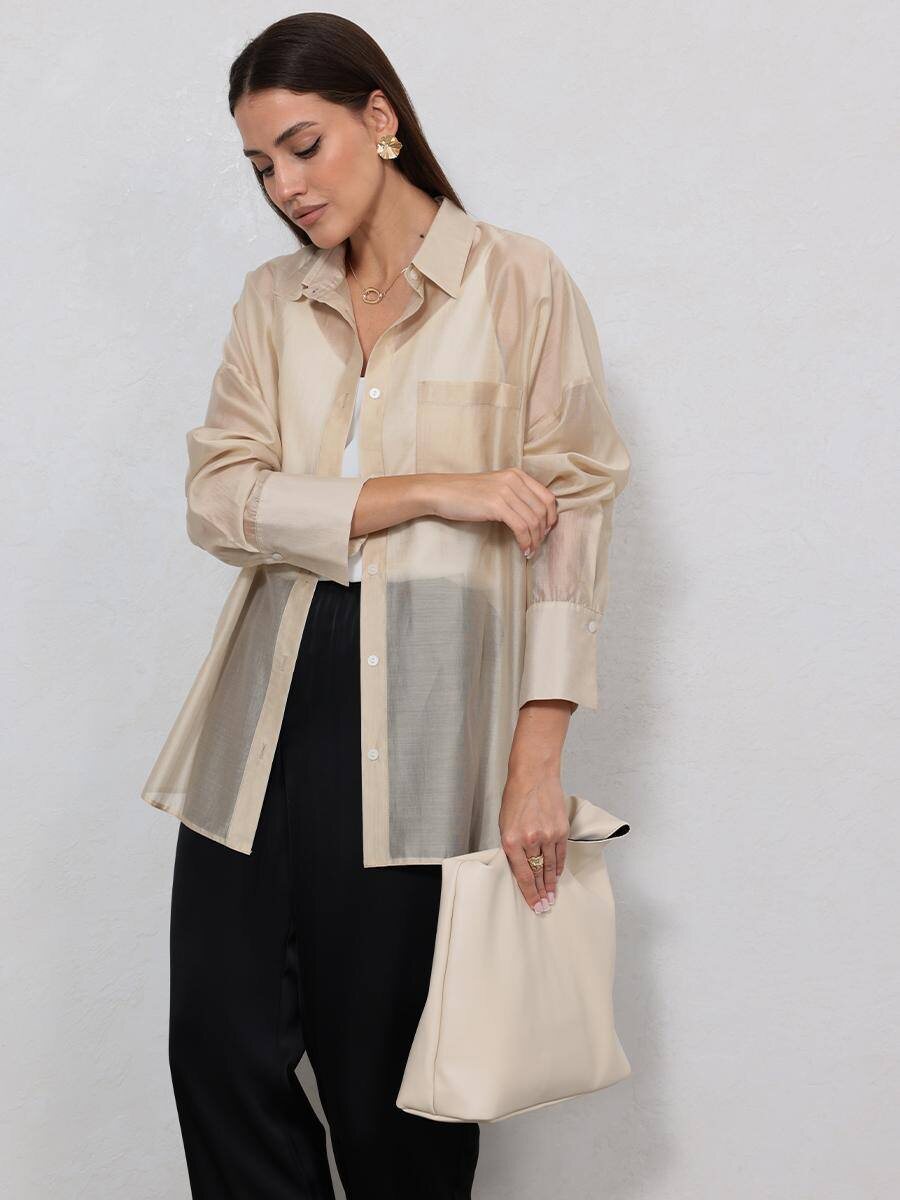 На любое время года и любой повод 🤍Рубашка из тенселя🤍 Рубашка выполнена из легкой полупрозрачной ткани, создающей воздушный и современный образ. Модель имеет свободный, слегка оверсайзный силуэт. Полупрозрачная фактура делает ее универсальной: можно носить поверх топов, бра или как самостоятельный акцент в многослойных образах. Идеально подойдет для повседневных и более изысканных комплектов✨ Состав: тенсел 100% Стоимость: 6 490₽