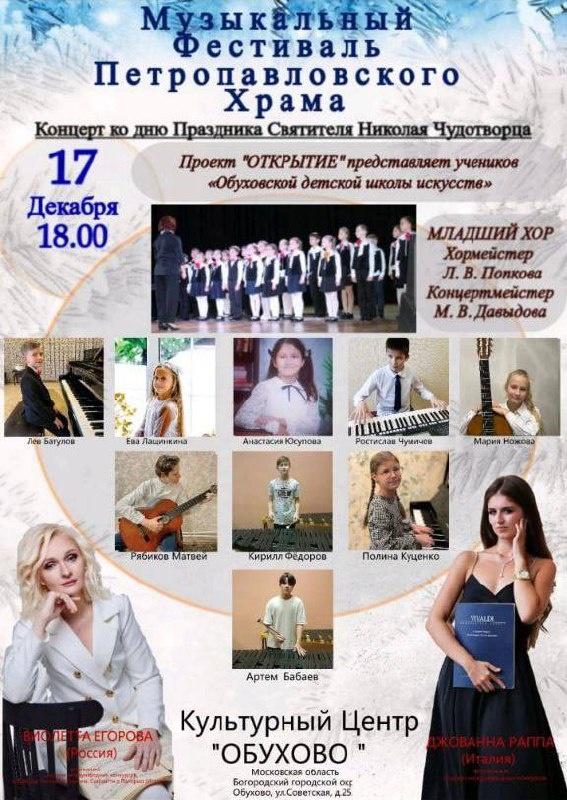 Друзья, приглашаем на музыкальный фестиваль Петропавловского храма п.Обухово! 📆 17 декабря в 18:00 📍Культурный центр «Обухово», п.Обухово, ул. Советская, д.25