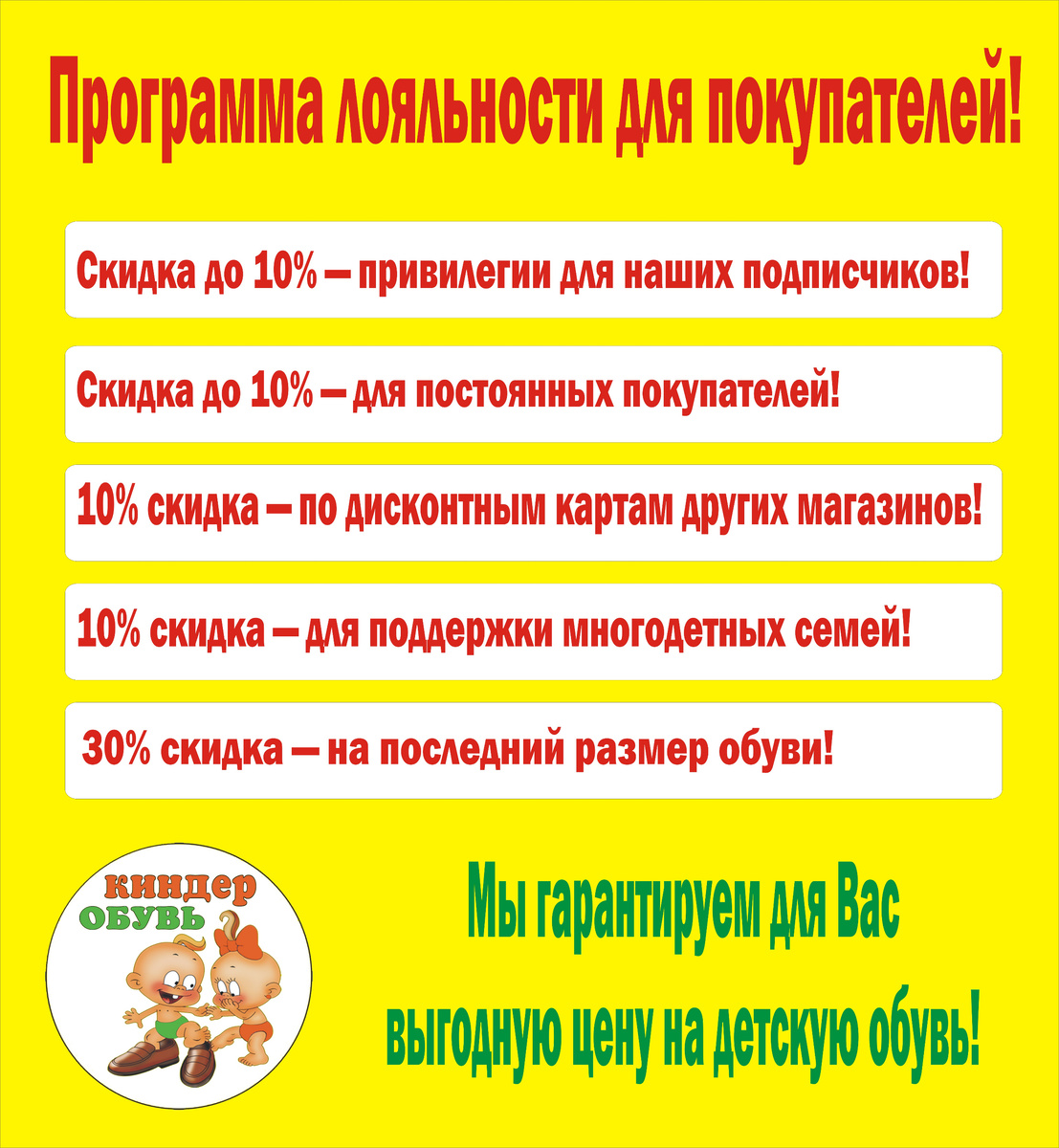 В магазине КиндерОбувь действует программа лояльности для покупателей: Скидку в нашем магазине можно получить даже при первой покупке — можно просто стать нашим подписчиком: ВКонтакте или Телеграм, так же скидку сразу можно получить многодетным, по карте скидок наших конкурентов или на последний оставшийся размер обуви. Мы гарантируем для Вас выгодную цену на детскую обувь! Скидка до 10% — привилегии для наших подписчиков! Для всех наших подписчиков при покупке первой пары обуви предоставляется