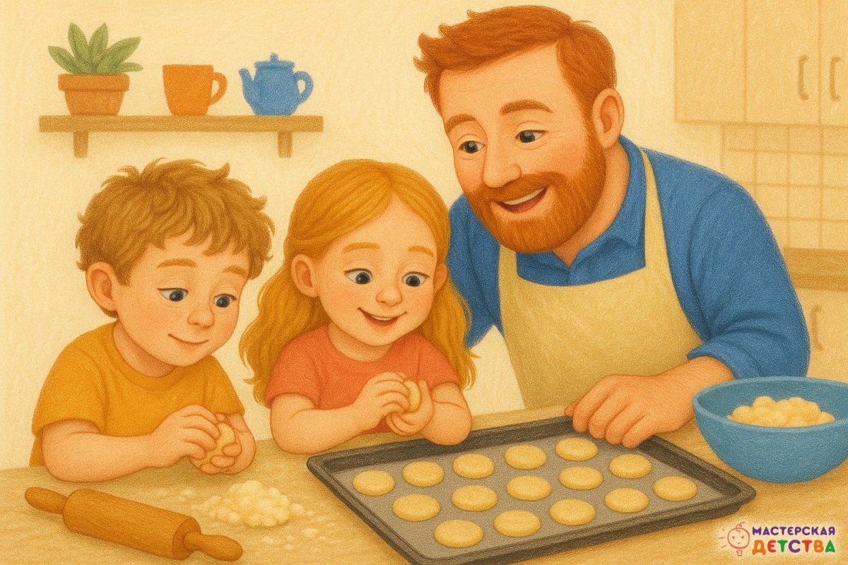 🍪 Выходные с папой: печенье, которое получается всегда Есть такой особый вид выходных, когда папа главный по кухне, дети главные по фантазии, а мука внезапно оказывается даже на ушах. И это нормально. Предлагаем папин формат печенья: - без сложных ингредиентов - без строгих правил - с большим запасом смеха 🍪 Как это выглядит Папа говорит: «Давайте эксперимент». Дети мешают, катают, лепят «непонятно что», дают печенькам имена и внимательно следят за духовкой, как за космическим кораблём. Тесто можно мять руками, катать шарики, сравнивать формы и спорить, чьё печенье «самое круглое». А если что-то получилось кривым, значит, авторское. ✨ Почему это работает — дети чувствуют себя настоящими участниками — папа становится «человеком процесса», а не «контролёром» — кухня превращается в место общения, а не заданий И пусть печенье закончится за 10 минут - эти выходные запомнятся надолго. 🍪 Папы, берите фартуки. Дети, готовьтесь командовать 💛 А у вас есть свои «папины» рецепты выходн