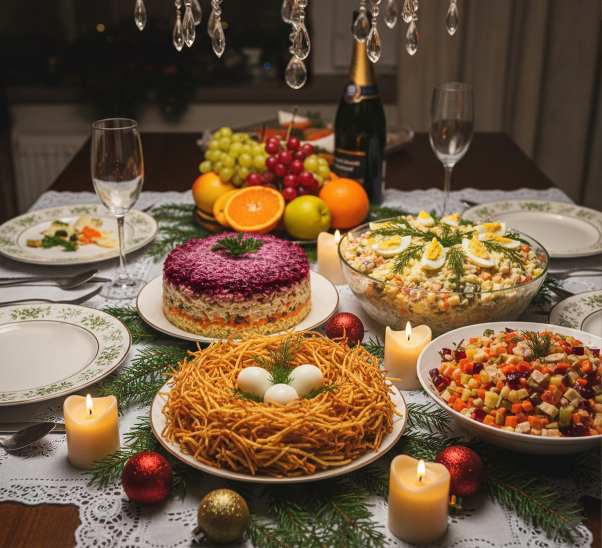 Эти блюда больше, чем просто еда. Это вкусо-временная машина, которая каждый год переносит нас в детство и создаёт тот самый новогодний дух. Давайте вспомним, как появились главные герои нашего стола. 🥗 Оливье: от роскоши к народной любви