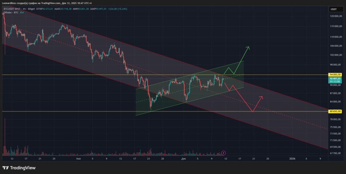 В ответ на пост #мнениепорынку 🕯🕯🕯 ⚠️Итак, коллеги, как сказал ранее, вчерашний сценарий с манипуляцией от уровня 90К отработал более, чем хорошо. И реакция от уровня (очередная) + и выход обратно на трендовую + и выход обратно на промежуточный блок = качели качаются = нервы напрягаются!! ⚠️Сегодня друзья, на ваше обозрение график BTC с минимальной разметкой и мыслями по технической картинки с немного другого ракурса. Вот если бы разбудили утром, предложили рассмотреть график, не озвучивая его принадлежность к тому или иному активу, чего ждать + куда пойдет?? 1️⃣График с 4Н ТФ, долгое время (более 60 дней), от своего HI движется в нисходящем канале, нижнюю границу которого можно корректировать в соответствии с собственным видением и желанием = факт остается фактом! Прямо сейчас график формирует классический паттерн поджатия уже ярко выраженного уровня 94К + верхняя граница канала = пробой которых по ТА вынесет цену на высоту паттерна вверх!! 🔤 При этом, внутри нисходящего канал