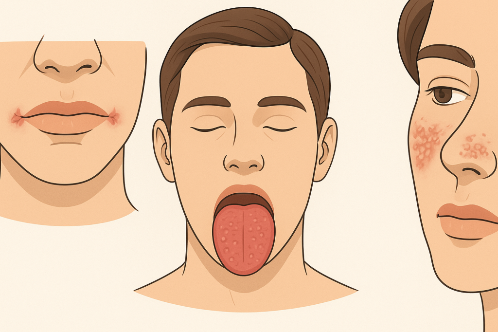 B2 (рибофлавин).Поражение кожи и слизистых, светобоязнь. Симптомы: «хейлит» – трещины в углах рта, воспаление губ, глоссит – малиновый, «лакированный» язык, себорейный дерматит (шелушение кожи), конъюнктивит.