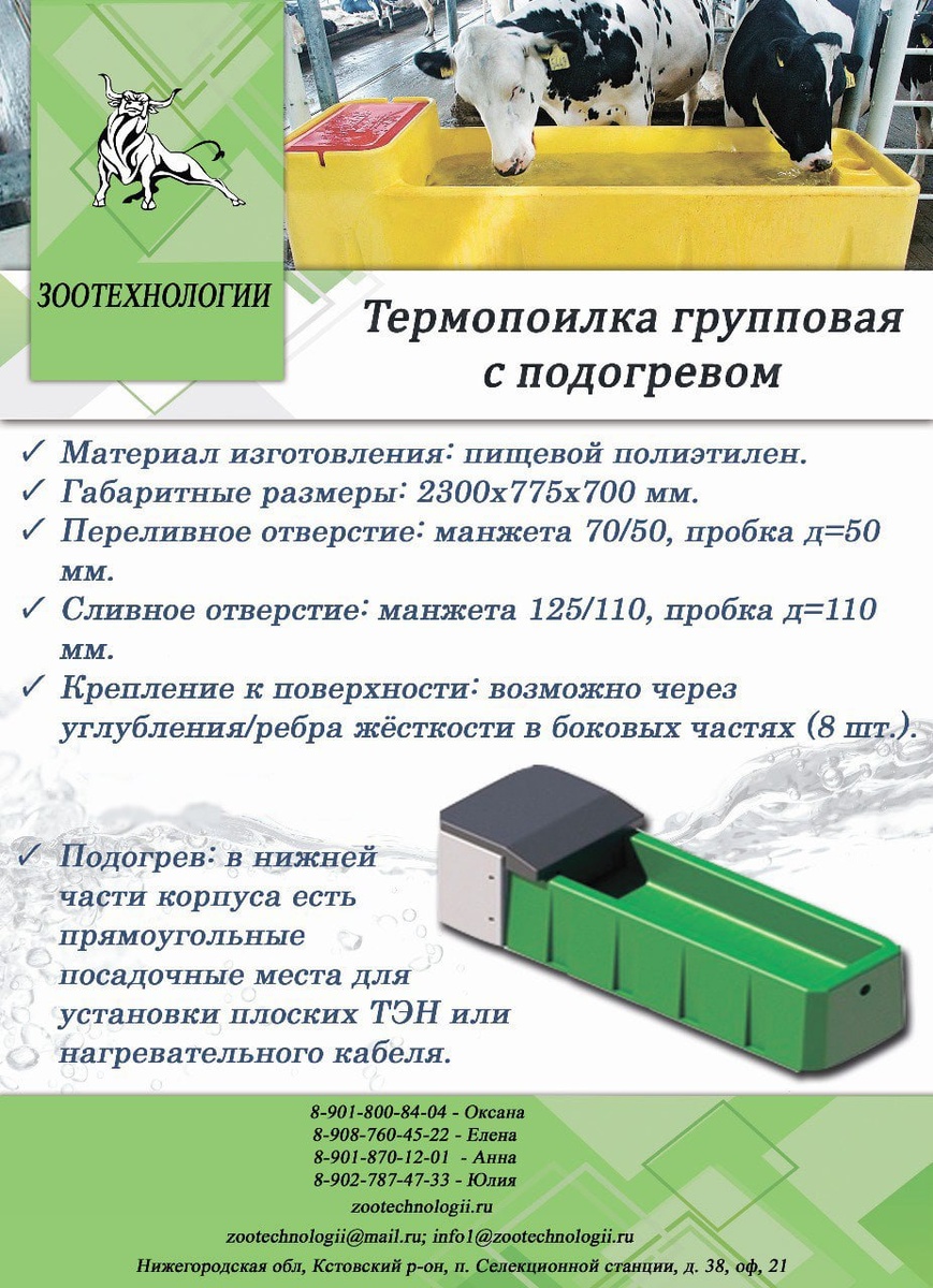 💦 В продаже поилка 2 м (зелёная, в сборе, с подогревом), которая предназначена для группового поения крупного рогатого скота (КРС) в аграрных предприятиях и индивидуальных хозяйствах. Некоторые особенности поилки: ➡️Работа по принципу термоса. Двойные стенки обеспечивают подачу воды даже при низких температурах. ➡️Подача воды осуществляется через водопровод, проложенный ниже уровня промерзания грунта. ➡️Регулировка уровня заполнения происходит за счёт входящего поплавкового клапана. ➡️Возможность установки нескольких вводных клапанов для увеличения скорости заполнения. ➡️Система подогрева поддерживает оптимальную температуру воды (12–20 °С). ➡️Защита от перегрева. Если уровень воды опускается ниже установленного значения, срабатывает автоматика защиты, которая отключает нагреватели. Оставить заявку можно у наших менеджеров: Оксана: 8-901-800-84-04 Елена : 8-908-760-45-22 Анна: 8-901-870-12-01 Юлия: