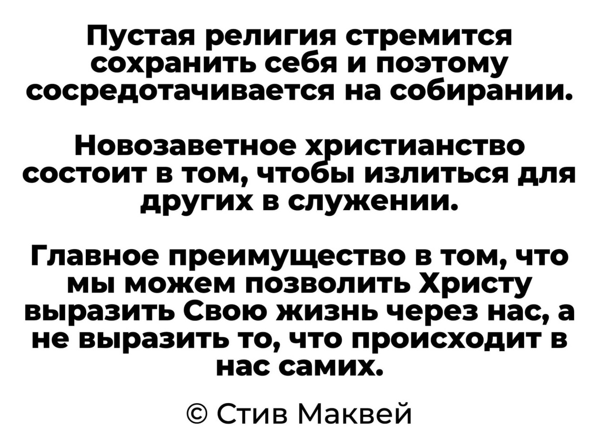 В изображении цитата. Хочу разобрать для себя. Пустая религия, мое откровение, стремится сохранять себя, сосредотачиваясь на сборе материальных благ или приверженцев. Такая религия не имеет подлинной духовности и не способна передать веру людям. Новозаветное христианство (дальше НХ), напротив — сосредоточено на служении другим. Оно призывает отдавать силы, время и ресурсы людям, помогая в нуждах и заботе о них. Это отличается от пустой религии, что сосредоточена только на себе и своих интересах. Преимущество НХ — оно позволяет Христу выразить Свою жизнь через верующих. Христос — источник жизни и спасения для людей. Его присутствие и действие в верующих дает возможность быть живыми свидетелями Христа и Его любви к нам. Верующие могут служить, проявляя любовь, сострадание и заботу, и тем самым исполняя волю Божью. Так НХ предлагает стать истинными свидетелями Христа и принести свет другим людям. Это помогает лично мне обрести истинное счастье и удовлетворение, и привести к Богу тех, кто