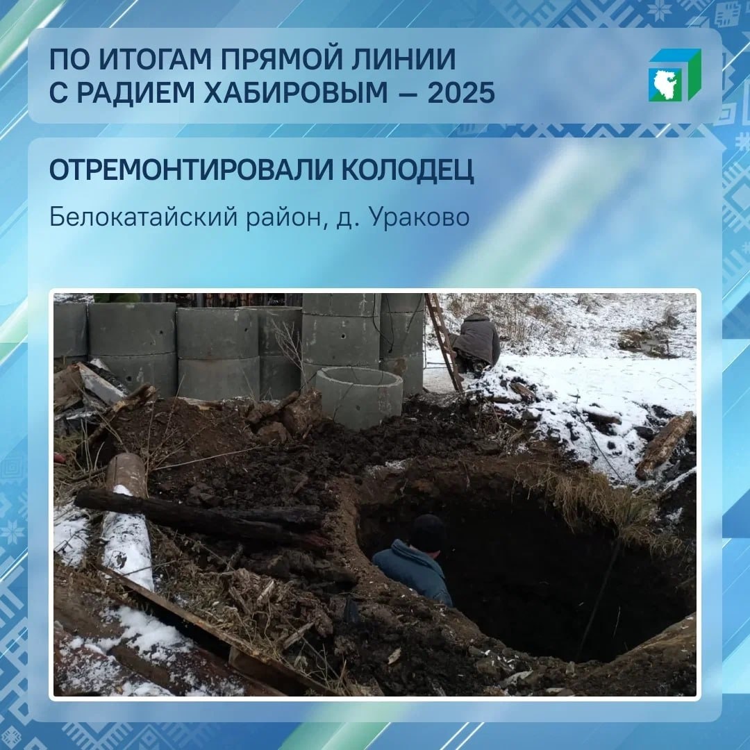 😀😃😄😁 В д. Ураково Белокатайского района отремонтировали колодец с питьевой водой. Восстановить старый деревенский колодец попросила сестра участника СВО. Свою просьбу она отправила на Прямую линию с Радием Хабировым, которая прошла 12 ноября 2025 года. Администрация Белокатайского района занялась решением вопроса. Выделили средства на ремонт и в конце ноября приступили к работе. Сегодня, 12 декабря, ремонт колодца полностью завершили. Всего на Прямую линию с Радием Хабировым в 2025 году поступило 9 591 сообщение, из них 3 236 не требуют отработки. В работу передали 6 355 сообщений, 3 139 – уже отработали. 💚 ЦУР Башкортостана