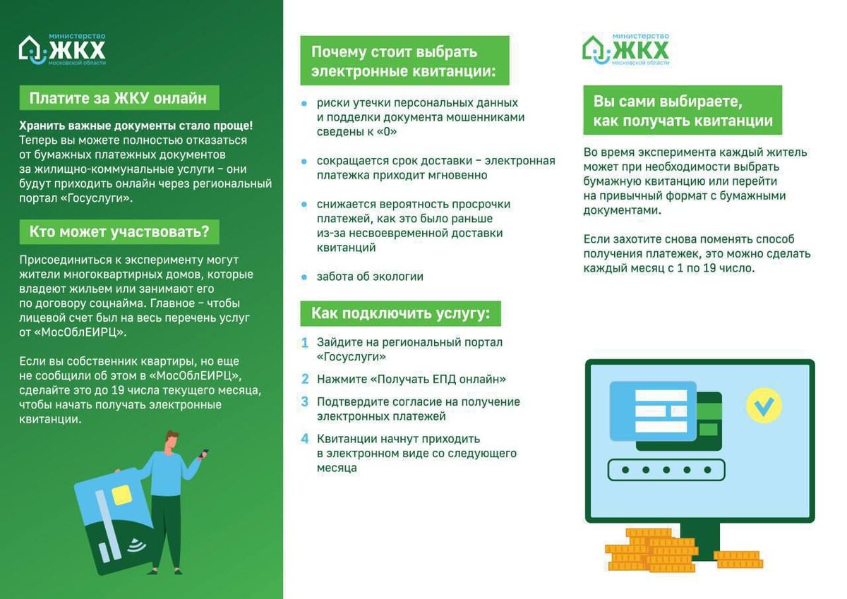 Министерство жилищно-коммунального хозяйства Московской области реализует современный формат оплаты жилищно-коммунальных услуг. Все платежные документы за ЖКУ будут доступны онлайн через региональный портал «Госуслуги». Переход обеспечивает более оперативный обмен данными, сокращает сроки доставки платежек и минимизирует риски утечки персональных данных. Проект предусмотрен как для собственников квартир в МКД, так и для граждан, занимающих жилье по договору социального найма. Для перехода на получение электронных квитанций с нового месяца необходимо сообщить ваш статус в МосОблЕИРЦ до 19 числа текущего месяца. Процесс подключения прост: ❕Зайдите на региональный портал «Госуслуги». ❕Нажмите на кнопку «Получать ЕПД онлайн». ❕Подтвердите свое согласие на получение электронных платежей. Переход на онлайн-оплату – это современное и надежное решение.