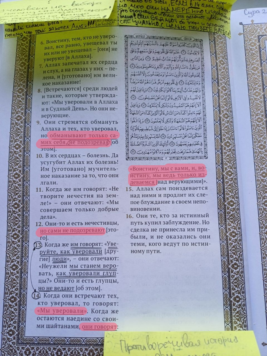 Рубрика "Вопросы при прочтении и изучении Корана". Сура 2. Аяты 8-14. ЧАСТЬ 4 Сура 2:8-14 Среди людей есть такие, которые говорят: «Мы уверовали в Аллаха и в Последний день». Однако они суть неверующие. Они пытаются обмануть Аллаха и верующих, но обманывают только самих себя и не осознают этого. Их сердца поражены недугом. Да усилит Аллах их недуг! Им уготованы мучительные страдания за то, что они лгали. Когда им говорят: «Не распространяйте нечестия на земле!» - они отвечают: «Только мы и устанавливаем порядок». Воистину, именно они распространяют нечестие, но они не осознают этого. Когда им говорят: «Уверуйте так, как уверовали люди», - они отвечают: «Неужели мы уверуем так, как уверовали глупцы?» Воистину, именно они являются глупцами, но они не знают этого. Когда они встречают верующих, то говорят: «Мы уверовали». Когда же они остаются наедине со своими дьяволами, они говорят: «Воистину, мы - с вами. Мы лишь издеваемся». В этих аятах представляется категория людей, которые говорят