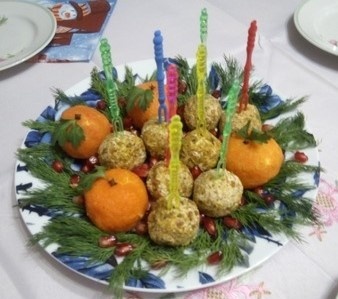 Копчено-солоноватый вкус сменяется сладостью лопнувшей на зубах виноградинки. Ингредиенты: колбаса "Сырокопченая Салями по-Черкизовски" — 70 г не надо брать очень твердую колбасу, блендер может не справиться!!! вспотел, Сырокопченую колбасу нарезать ломтиками Поместить ломтики колбасы в чашу блендера Измельчить вместо сырокопченой колбасы можно использовать куриное филе копченое сыр творожный (или майонез, сметану) — 200 г соль и карри - по вкусу яйца куриные отварные - 2 шт. (по желанию) можно добавить обжаренные грибы сыр твердый — 100 г Добавить творожный сыр (или майонез, сметану) и твердый сыр. + яйца отварные 2 шт. (по желанию) Взбить в блендере. + карри и соль ОТРЕГУЛИРОВАТЬ!!! Полученную массу отправить в холодильник на полчаса. виноград без косточек!!! (или чернослив, оливки фаршированные, ягоды физалиса) — 8 шт. фисташки (фундук, миндаль) очищенные, измельченные — 50 г гранат (для украшения) — 100 г (по желанию) приготовление: Из охлажденной массы формируют шарики размеро