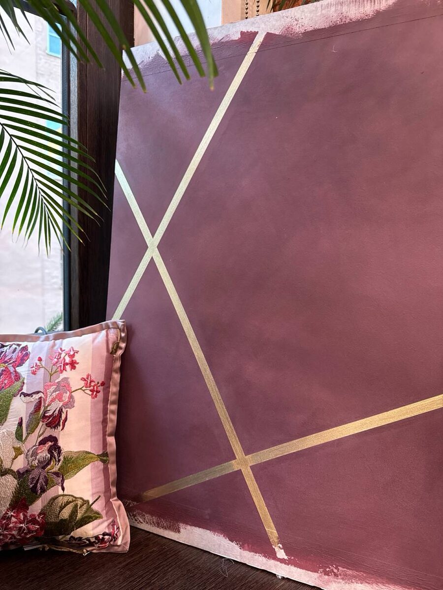 На мастер-классе Катерина также показала способ декорирования стен акцентами. Мы взяли краску с эффектом металла Oikos Imperium и предварительно нанесли на основу и заклеили бумажным скотчем. После подсыхания основного слоя скотч снимается, обнажая золотые линии. Получается эффект замшевых стеновых панелей с латунными молдингами 😍